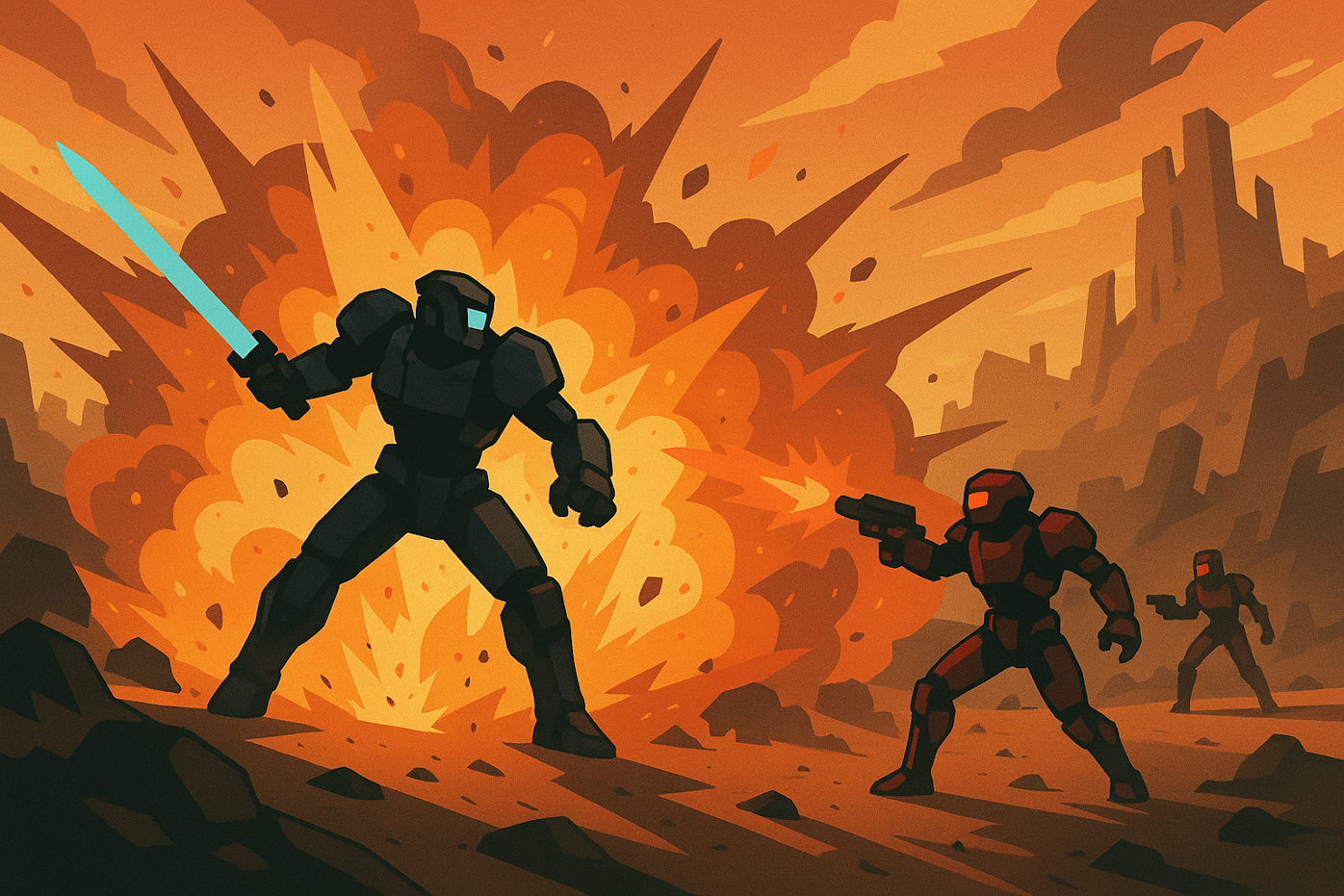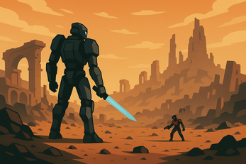 NovaMesh is a 3D, third-person action-adventure game set in a stylized vector-based post-apocalyptic world. You play as a lone mech, awakened amidst the ruins of a forgotten civilization. Armed with an upgradeable power saber, pistol, and grenade launcher, you must explore, survive, and uncover the mysteries of a devastated planet filled with hostile machines and buried secrets.